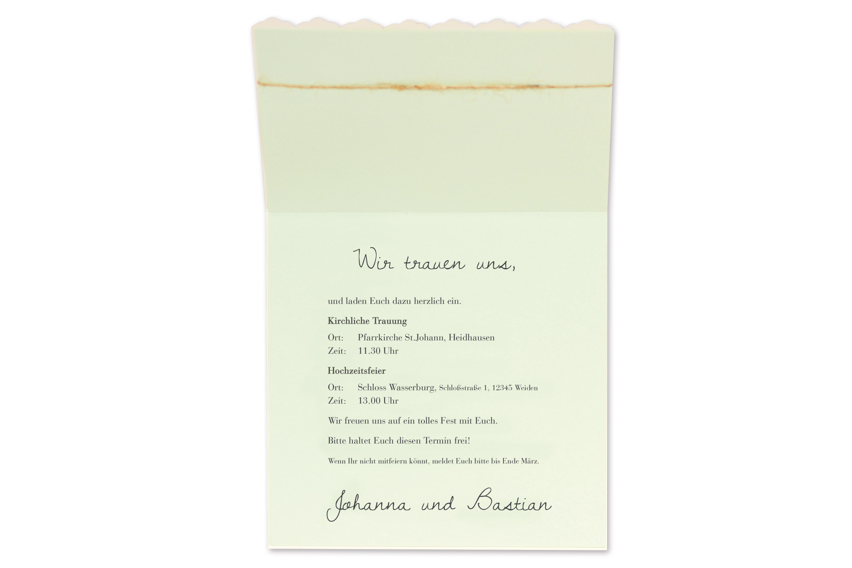 Seitenformat: 155 x 155 mm. Druck: auf Innenseite. Text: wird als Worddokument (unformatiert) von Ihnen beigestellt. inkl. passendem Kuvert Die Layoutanpassung erfolgt durch Tiebeldruck. Eine Ansicht zur Druckfreigabe erhalten Sie per E-Mail. +++ Durch Anklicken des rechten Bildes sehen Sie eine vergrößerte Version bzw. weitere Darstellungen der Karte. Ideal kombiniert mit 17D307 - Dankkarte, 17M207 - Menükarte, 17T407 - Tischkarte, 17S507 - Save the Date